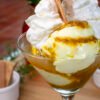 Deliciosa copa de helado sabor arequipe, acompañada de salsa de arequipe, galleta crocante y merengón.