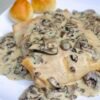 Crepe relleno con pollo y queso mozarella, bañado en salsa de champiñones, para deleitarse.